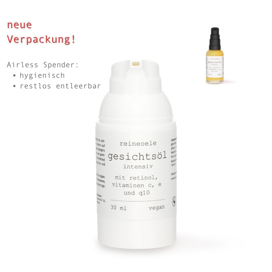 gesichtsöl intensiv (früher faltenlos) bietet eine reichhaltige Pflege für die reifere Haut mit Retinol, Vitamin C, Vitamin E und dem Coenzyme Q10. Unser Oleogel ist für jeden Hauttyp geeignet.
