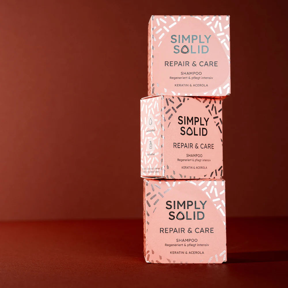 Das Repair & Care Shampoo-Solid ist dein Spezialist für beanspruchtes und geschädigtes Haar. Mit Keratin und Acerola-Extrakt repariert es die natürliche Haarstruktur, spendet intensive Feuchtigkeit und macht trockenes Haar wieder geschmeidig. Trockenheit wird gezielt bekämpft, während dein Haar sichtbar stärker, glatter und glänzender wird.